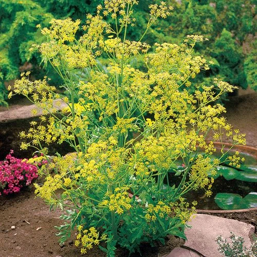 Dill flowers also attract beneficial insects that prey on aphids. Beautiful flat-topped yellow blooms add beauty to the herb garden, vegetable patch, and even the annual flower garden. Pinch off the flower buds if you are growing dill for its foliage (dill weed); the flavor will be most intense before the plant blooms. But if you want to harvest the seeds too, let the plants bloom and dry out, placing a paper bag over the flowerheads in fall to collect the seeds. And you may want to leave a few plants uncovered; dill will readily self-sow if the seeds are allowed to fall and left undisturbed over winter.