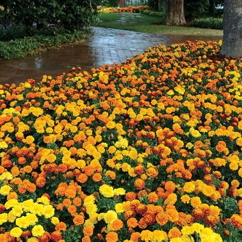 Hot Pak™ Mixture Marigolds create mounds of foliage and full blooms in shades of vibrant yellow, rich orange, and scarlet. Some blooms are solid colors, while others are multicolored. The blooms hang around longer than African type marigolds, providing blooms right up until the frost, and they won’t fall over.