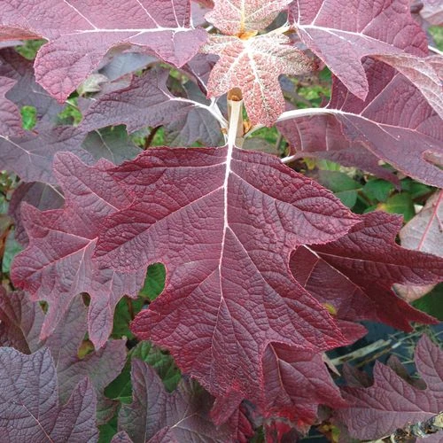 The foliage is almost as handsome as the blooms on this Hydrangea. Large and deeply lobed, it is a rich shade of forest green in spring and summer, then turns deep red to burgundy and maroon for autumn before dropping. The bare winter skeleton of Gatsby Pink® is attractive as well, showing off the interesting patterns of the bark.