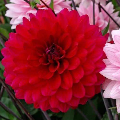 This pair offers complementary colors and forms you will love. Naomi® is a decorative dahlia, fully double and boasting burgundy petals so rich they look smoky-black at the heart of the big 4- to 6-inch blooms. A scene-stealer in any setting, this tall, well-branched dahlia takes over in well-drained, rich, moist soil. Make it a centerpiece of any border or bed.