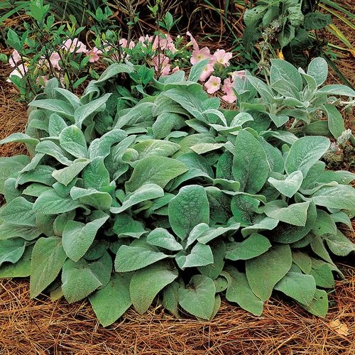 Stachys ‘Helene von Stein’ Lambs Ear, also known as ‘Countess Helen von Stein’ or ‘Big Ears’, is an herbaceous evergreen (in mild winter climates) perennial grown for its ornamental foliage that has unique texture and color. Considered the best of the species, ‘Helene von Stein’ has much larger and darker leaves than is typical. In fact, at up to 12 inches long, the huge lanceolate leaves grow twice as big as the species. The plant creates a beautiful rosette of soft, fuzzy, grey-green leaves with a velvety feel, a silvery cast, and a shape like its namesake. Although it is listed as a non-flowering cultivar, it may occasionally send up a few small flower stalks.