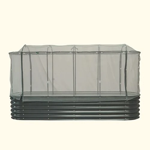 The Vego Garden Modular Cover System keeps pests out but allows air, sunlight, and moisture in; and the irrigation system, with adjustable mister nozzles, works with a standard garden hose to gently mist your plants. This Mesh Cover fits the 2′ x 8′ configuration of the 9 In 1 Modular Metal Raised Bed.