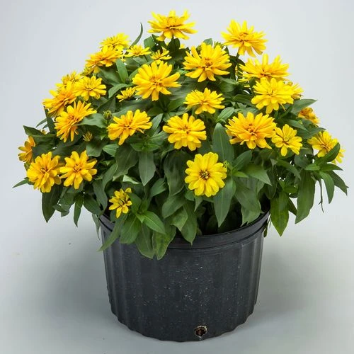 A Zinnia marylandica cultivar, bushier and more compact than many zinnia varieties, Zydeco Deep Yellow Zinnia has an upright, mounding habit and a fast growth rate. This zinnia creates a bright, crayon-colored mound and is shown to best effect grouped or massed in beds, borders, and patio pots.